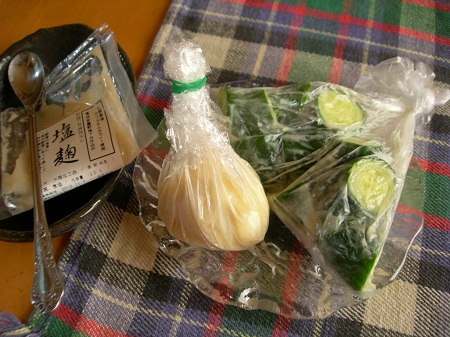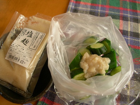先ずはキュウリ1本と塩麹は軽く大さじ1杯。