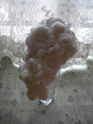 角真綿をほぐしてふわふわもこもこになった綿をお花のようにして、