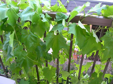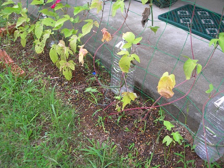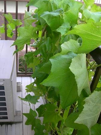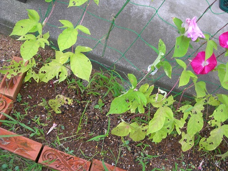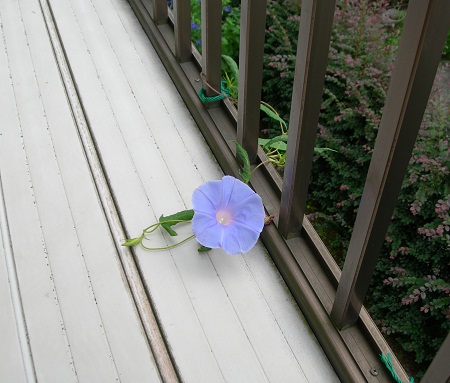 2階のベランダに一番乗りした朝顔がなんだかちょっと淋し気です。