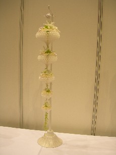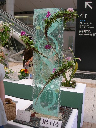 右は第1位作品。ガラスの柱から飛び出したアレンジが飛行のイメージですね。