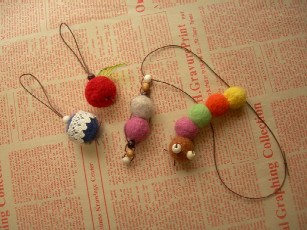 色とりどりのフエルトボールをつなげたり、ビーズや