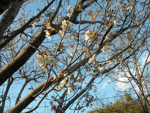 上を見上げてよくみたら、家の前の遊歩道の桜が咲いていました。