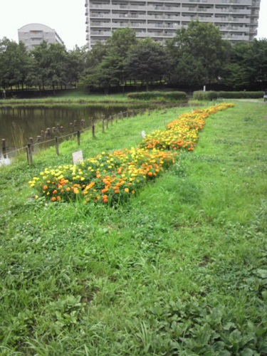 池の周りには南山田小学校の児童が植えたマリーゴールドが