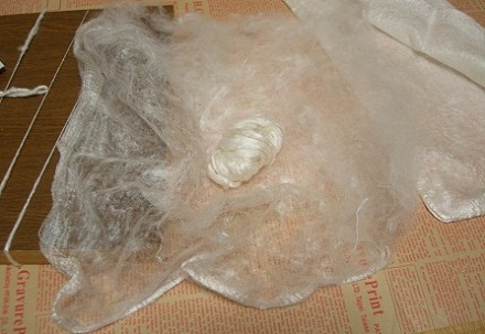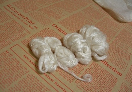 角真綿をまた前回のように綿にして、糸状になるように引っ張って・・・