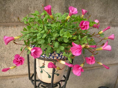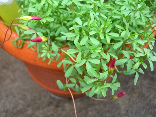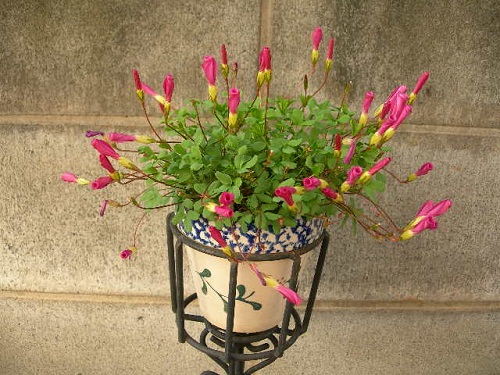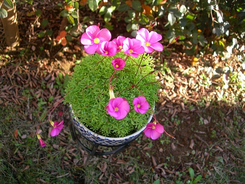 真ん中に3本、青空に向かって延びているのはオキザリス。