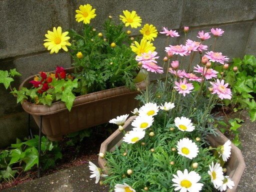 玄関前、西側にはケイトウと黄色のマーガレットを。