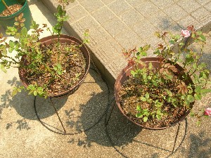 両方とも、最近元気がないと思ったら、ミニバラのほうは青い毛虫がむしゃむしゃと