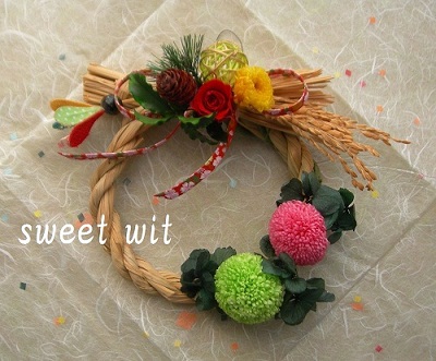 わらリースに小菊・ミニバラ・ピンポンマム・松などをアレンジ