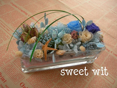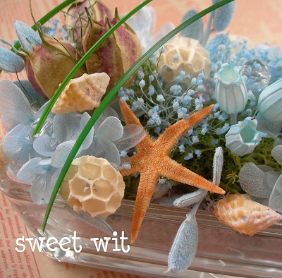 他にも貝がらやブルーカラーのモス、細いペアグラスも使いました。