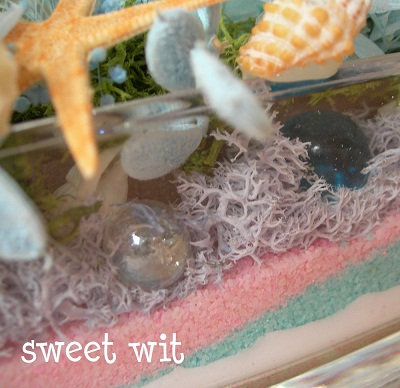砂の層の上に、貝がらやビー玉を入れてから