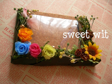 プリザーブドのバラ・アートのひまわり・鳥ピックがポイントです。