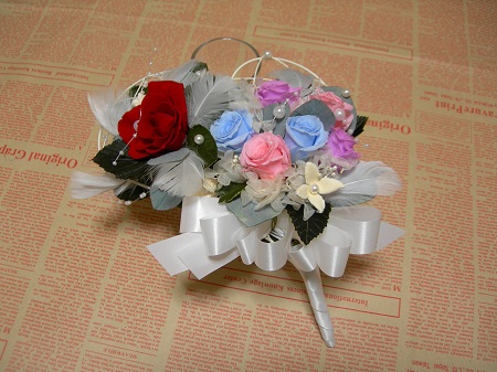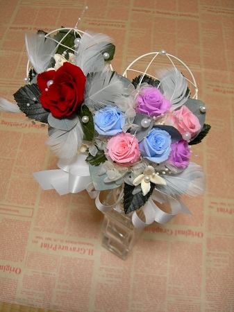 赤いバラはお得意のメリア加工でひとまわり大きくして、小さいパステルカラーのバラは