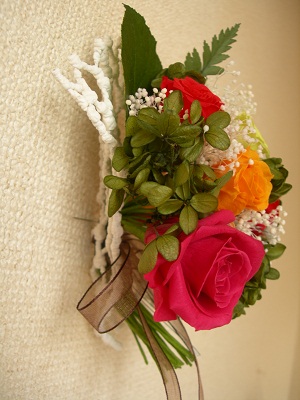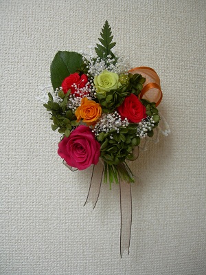 ブーケですと持つタイプの形に仕上げ、ブーケスタンドに挿して飾りますが、これは壁にかけて